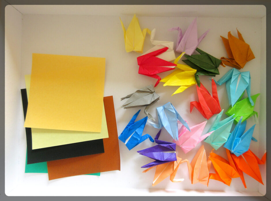 スの上に置かれた箱に、小さな折り鶴が