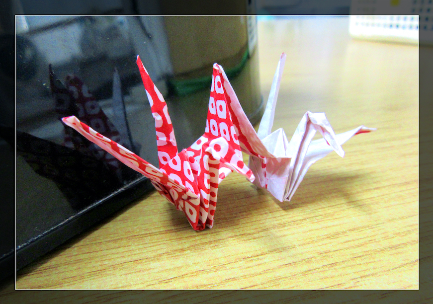 写真の中で並ぶ2羽の折鶴は、何と羽根